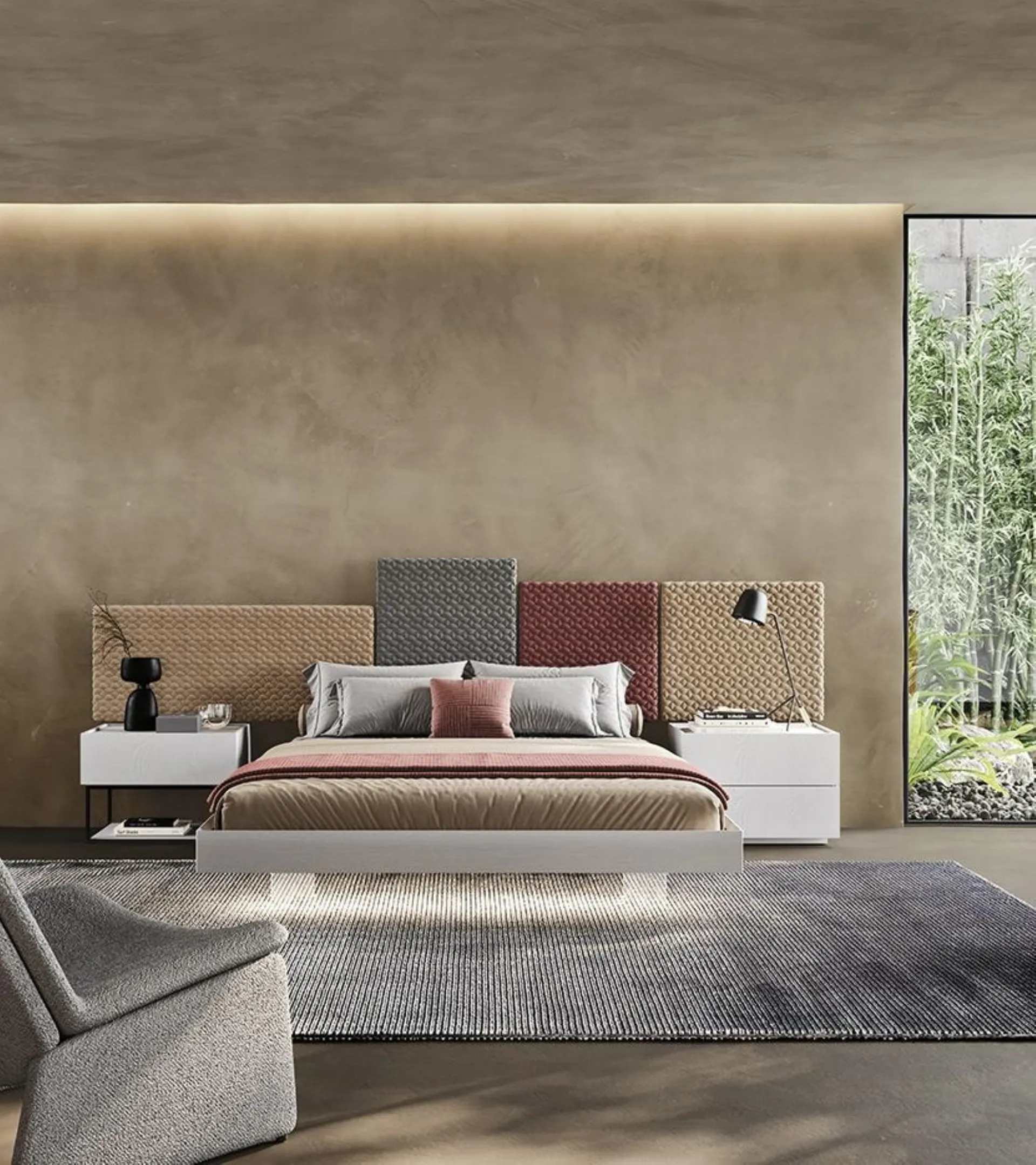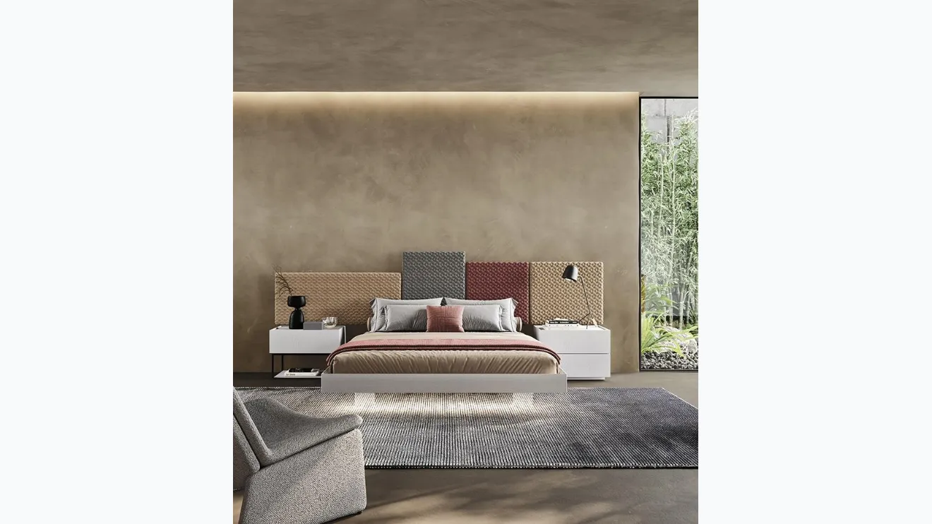 Si vous voulez recréer une ambiance intime et relaxante, le modèle montré en photo est fait pour vous : dans la chambre à coucher vous devrez recréer une ambiance relaxante, pour vous ressourcer comme vous le méritez. Si vous voulez meubler des espaces modernes, nous vous attendons pour vous montrer notre profil Mobilier Maison et réaliser votre concept sur mesure. La durabilité des matériaux et le grand confort sont les aspects qui distinguent tous les produits de l'entreprise, y compris le lit en tissu sur la photo. Découvrez dans notre salle d'exposition une large gamme de lits sommiers, meubles et accessoires pour la zone nuit des meilleurs fabricants. Avec le Lit Tetris avec une tête de lit boiserie de Mobilgam de la célèbre et renommée marque, leader du secteur, vous pourrez compléter votre espace nuit en vous assurant confort, fonctionnalité et un design épuré.