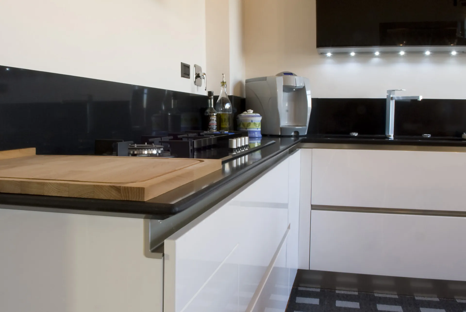 Cuisine laquée brillante sans poignées, avec des rainures en aluminium effet acier qui s'associent à la structure chromée des chaises et de la table Bontemp modèle Barone avec un plateau en cristal extrawhite blanc. La composition est enrichie par la plaque de cuisson Franke en cristal de 120 cm et la hotte Falmec Mirabilia.
