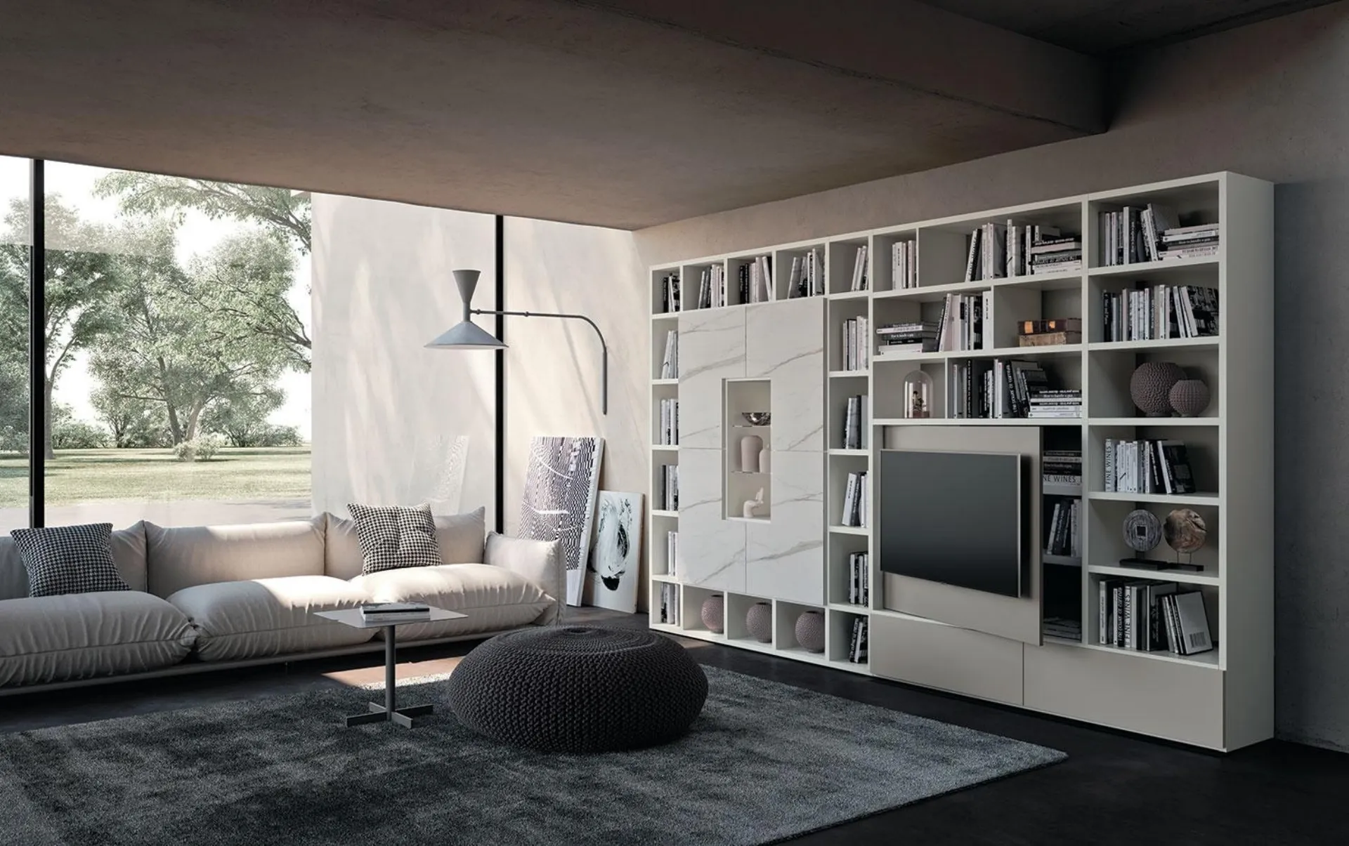 Découvrez dans les meilleurs magasins de meubles les bibliothèques murales les plus exclusives, y compris les modernes laquées mates, idéales pour embellir tout type de séjour. Le modèle visible sur la photo est la Bibliothèque murale Horizon 943 de Mobilgam, l'un des meubles de séjour réalisables sur mesure pour vous de la célèbre marque de mobilier Maison. Dans notre showroom, nos conseillers vous attendent, prêts à vous présenter des meubles et des accessoires beaux et pratiques pour vos intérieurs. Garder le salon en ordre n'est pas sa seule tâche : avec cette bibliothèque, vous pourrez concevoir le projet d'aménagement que vous avez toujours rêvé, en valorisant chaque espace. Concevoir le salon est simple si l'on choisit la bonne bibliothèque pour meubler son espace, l'important est qu'elle soit spacieuse et agréable.