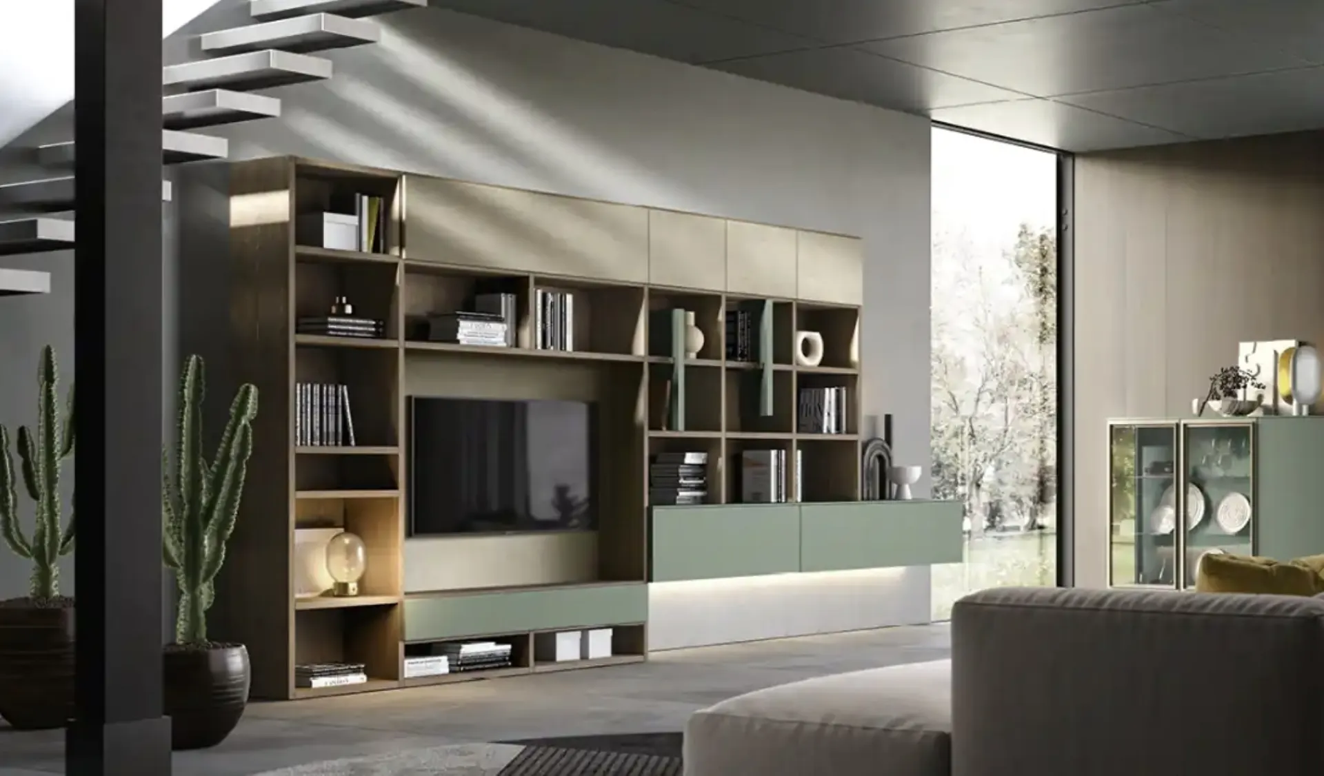 Texture de qualité et lignes fermes : découvrez la bibliothèque Kosmos KL205 de Moretti Compact Giorno Notte parmi les plus belles bibliothèques murales modernes.