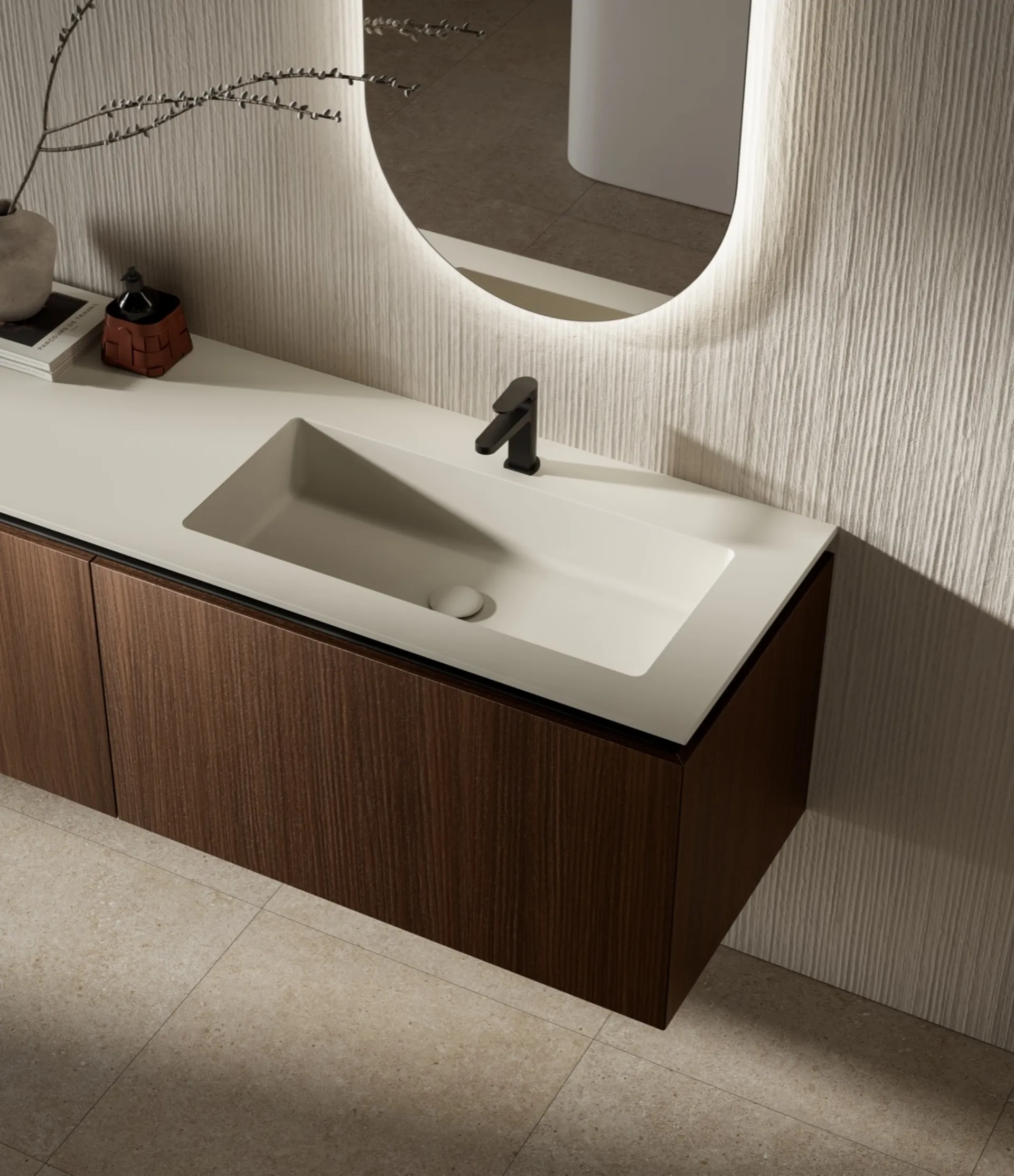 Décorez la pièce de bien-être moderne parfaitement avec Alto 11, meubles de salle de bains suspendus et accessoires en stratifié de Puntotre.