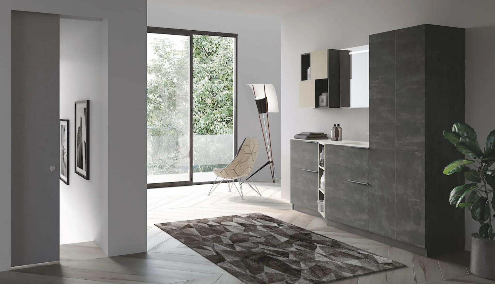 Obtenez des informations sur le mobilier de salle de bain moderne : des meubles de salle de bains en stratifié comme le modèle Laundry 14 de Puntotre vous attendent.
