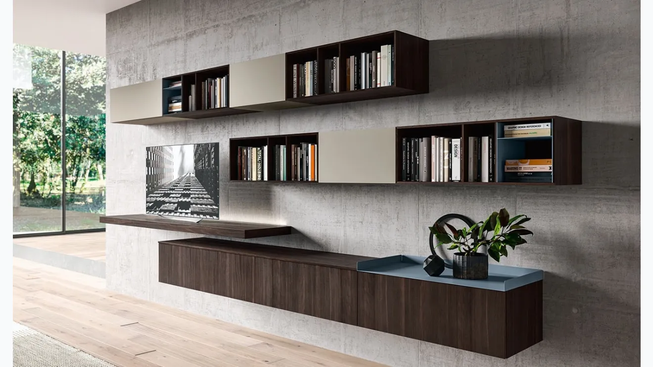 Découvrez le mur équipé LK01 de Cinquepuntozero pour meubler le salon selon vos besoins personnels