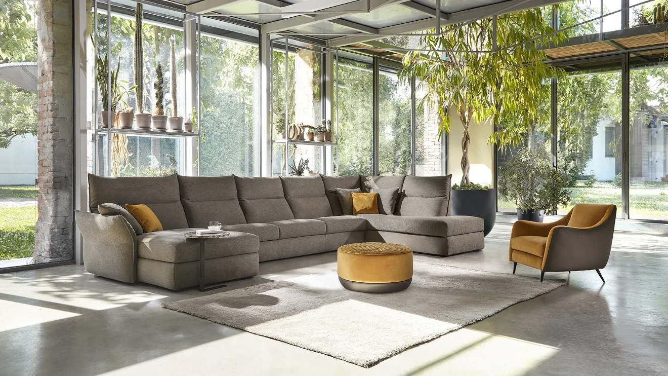 Salons et canapés avec méridienne Rosini Divani: voici pour vous le modèle Séville en tissu pour valoriser la zone jour.